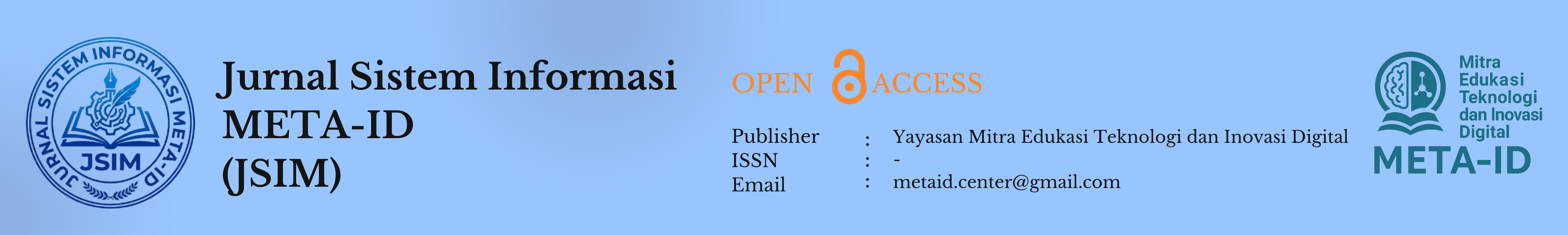 Jurnal Sistem Informasi META-ID (JSIM) merupakan jurnal ilmiah yang memuat artikel-artikel di bidang sistem informasi yang mencakup pengembangan perangkat lunak, analisis dan perancangan sistem, basis data, keamanan informasi, kecerdasan buatan, serta penerapan TI di berbagai sektor. Jurnal ini menjadi wadah bagi akademisi, peneliti, praktisi IT, dan mahasiswa untuk mempublikasikan penelitian, studi kasus, maupun inovasi teknologi yang berkontribusi pada pengembangan dan implementasi sistem informasi.